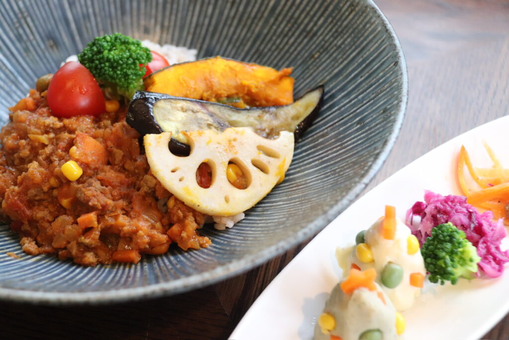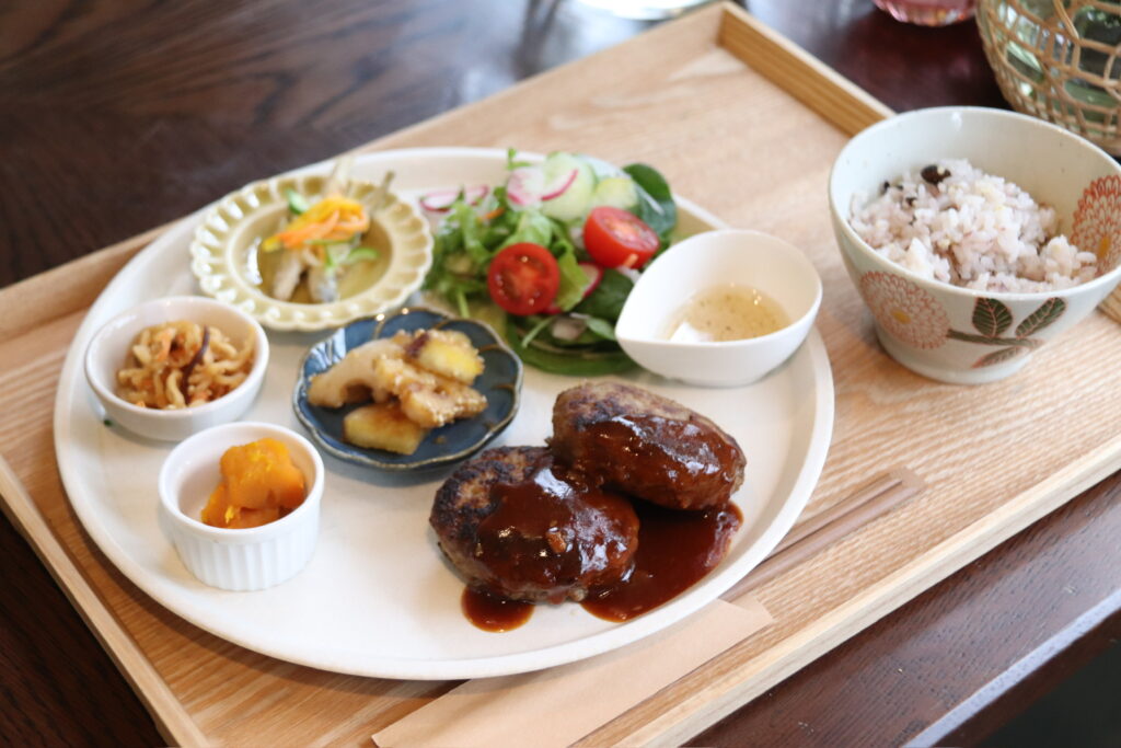 イチオシのhanaオリジナルのハンバーグは糀の力で柔らかく、まろやかな甘みが絶品。副菜は季節の野菜と、糀調味料をふんだんに使用しました。身体にも腸にもやさしいお食事を。